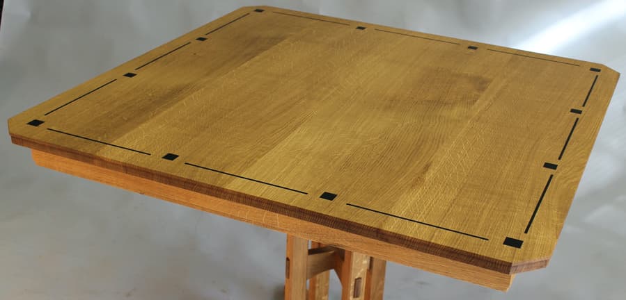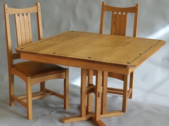 This Cotswold Style pedestal table comfortable seats four. It is available with or without the ebony inlay as shown here. It can be re-designed longer as a double pedestal table to seat up to ten.