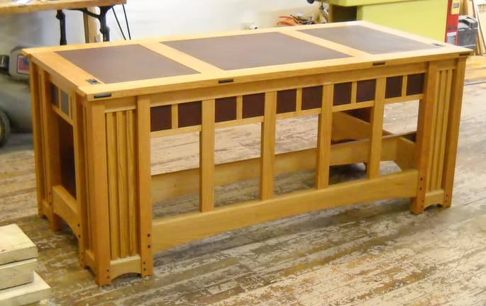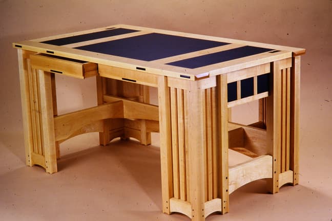 This custom executive desk, designed here in Maine in 1993, is one of my favorites. I have custom-made 20 versions of this desk so far, for clients as far away as Brussels and San Francisco. Most have been in cherry with black leather, but other wood species and leather colors can be combined very successfully. Includes three shallow drawers over the knee-well, wire access grommets through the top, and a hidden wire-management unit. The inspiration for this design is the architectural style of Frank Lloyd Wright, particularly the front facade of his Wards Willets House.