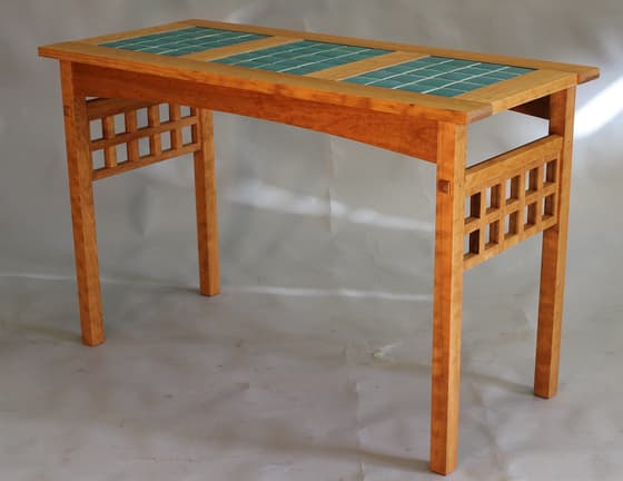 This modern Arts and Crafts table owes much to Asian-inspired furniture. The tiles on top (of your choice) provide a moisture-proof setting for plants, or to display small sculpture, pottery or other art works. The base can be customized, as in the last image, to compliment other furnishings.